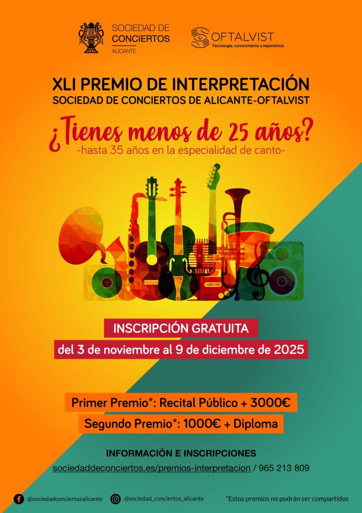 Abierta la XLI Edición de los Premios de Interpretación “Sociedad de Conciertos de Alicante-Oftalvist” 2025/26. Ver Bases del Concurso.